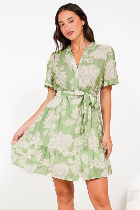 Dolly Mini Dress - Mandarin Collar A-Line Dress with Waist Tie in Byron Print Green