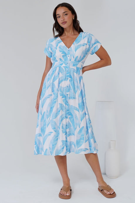 Leigh Midi Dress - V-Neck Button Down A-Line Dress in Malibu Print Blue