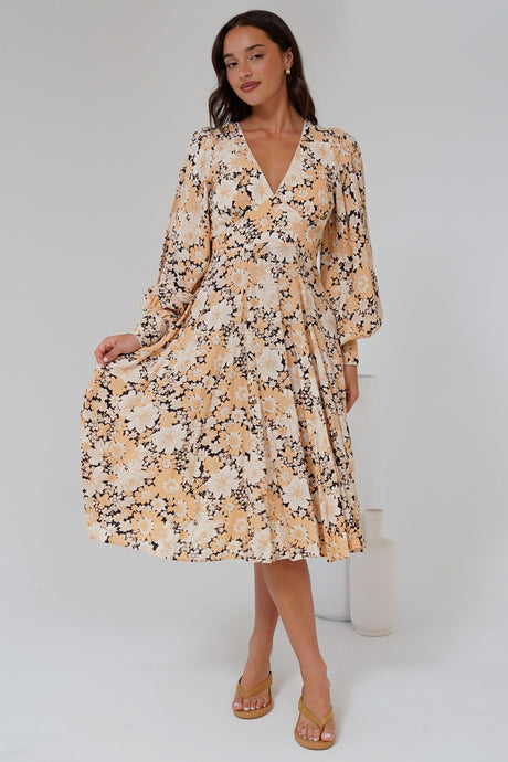 Laurina Midi Dress - Deep V-Neck A-Line Dress with Waist Tie in Fresca Print Black
