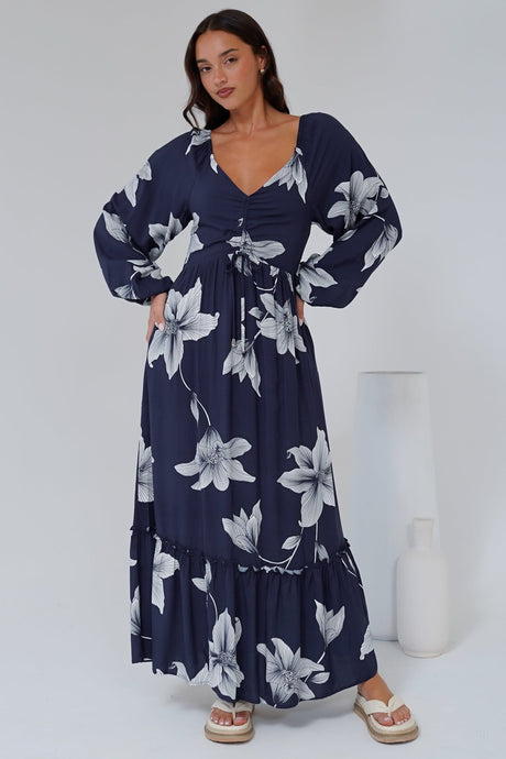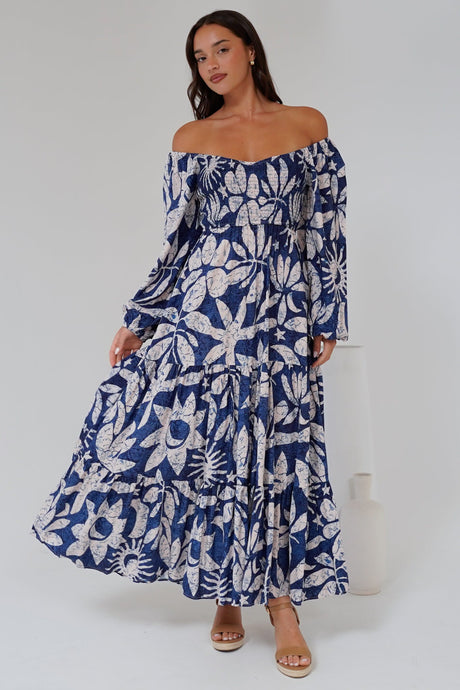 Priscilla Maxi Dress - On or Off Shoulder A Line Dress with Elasticated Back in Midnight Lily Print