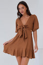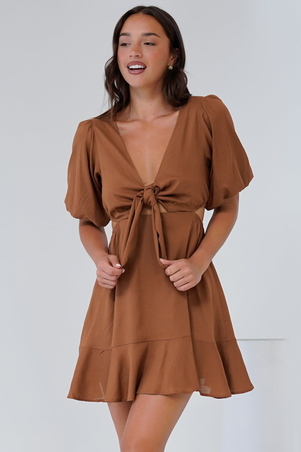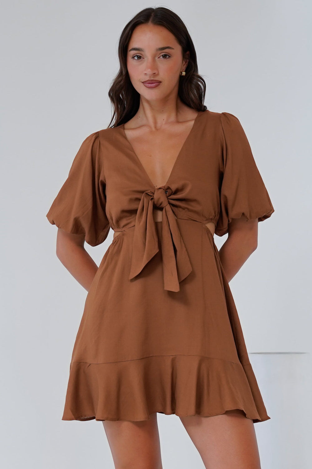 Awanda Mini Dress - Tie Up Bust Cut Out Dress with Ruffle Hemline in Brown
