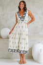 Laurina Midi Dress - Deep V-Neck A-Line Dress with Waist Tie in Fresca Print White