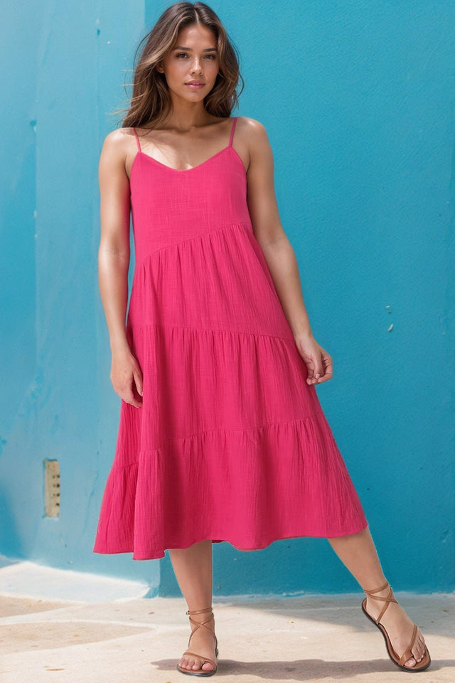 Rinley Midi Dress - Adjustable Strap Tiered Dress in Hot Pink
