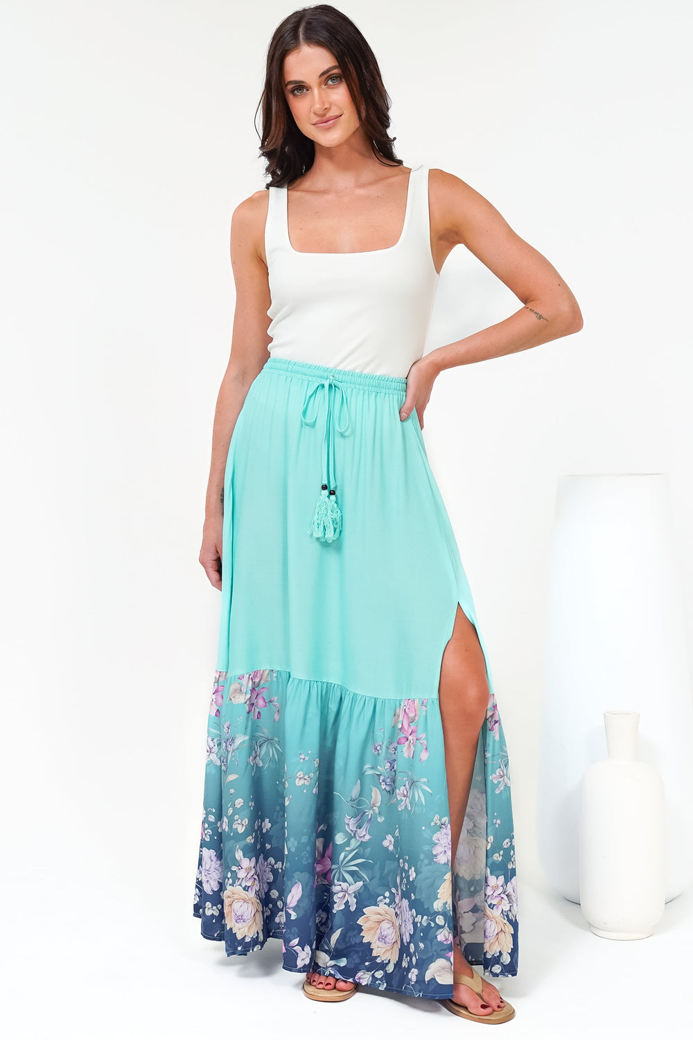 How sweet is our new Hellen Maxi Skirt in Candyce Print Blue. This stunning skirt will have you feeling pretty and comfy in its stunning floral print and relaxed fit. It is sure to be a go-to staple in your wardrobe. Wear with a cropped white tee and sandals for the perfect boho casual look.