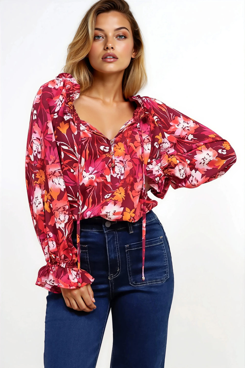 The Briar Blouse is romantic elegance made easy. This pull-over top features a charming frill collar and statement balloon sleeves that bring volume and drama to the silhouette. Rendered in our exclusive Monroe floral print, this piece effortlessly elevates your everyday wardrobe. The relaxed fit and button-down bodice detail make it perfect for everything from casual coffee dates to elevated occasions—simply style with your favourite denim or tuck into a flowing skirt.