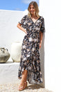 London Maxi Dress - Elasticated Waist Button Detail High Low Dress with Flutter Cap Sleeves in Sorrento Print Black
