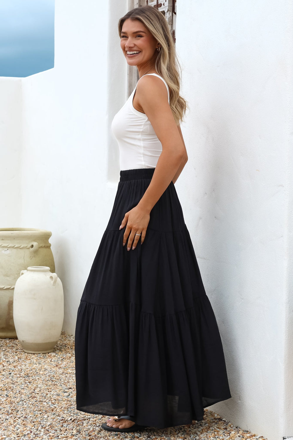 Anka Maxi Skirt - High Waisted Tiered A-Line Skirt in Black