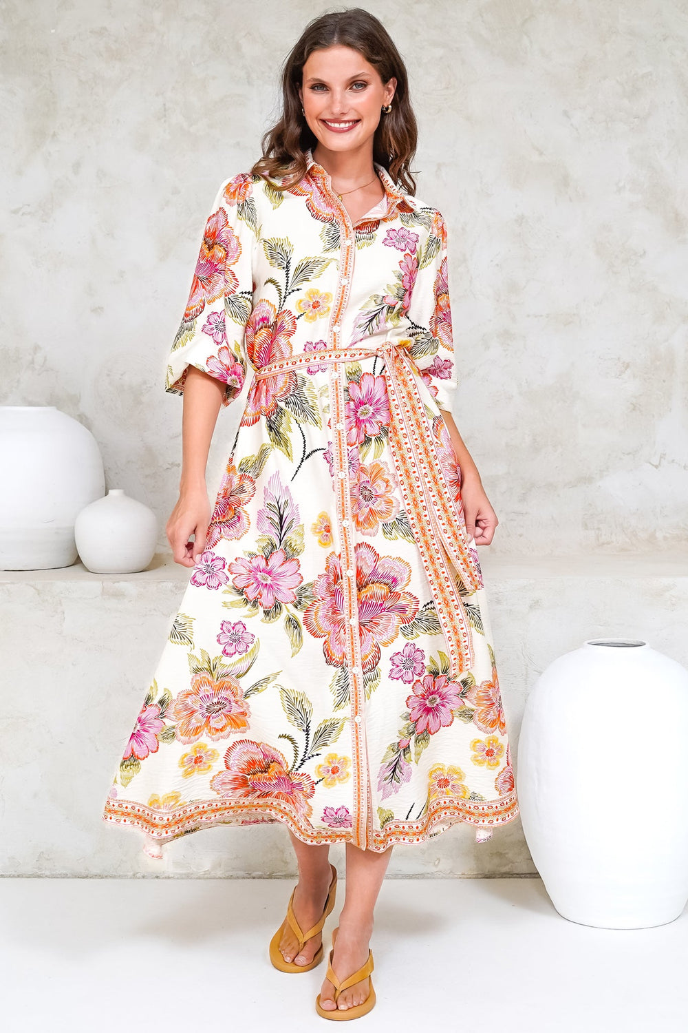 Our Francis midi dress is an effortlessly charming take on the classic shirt-dress, featuring a crisp collar and full-length button placket for a structured feel. Designed with dramatic puff sleeves and cinched at the waist with a wide, matching self-tie belt, this piece creates a feminine and defined silhouette. The easy-wearing midi length makes it perfect for transitional weather.