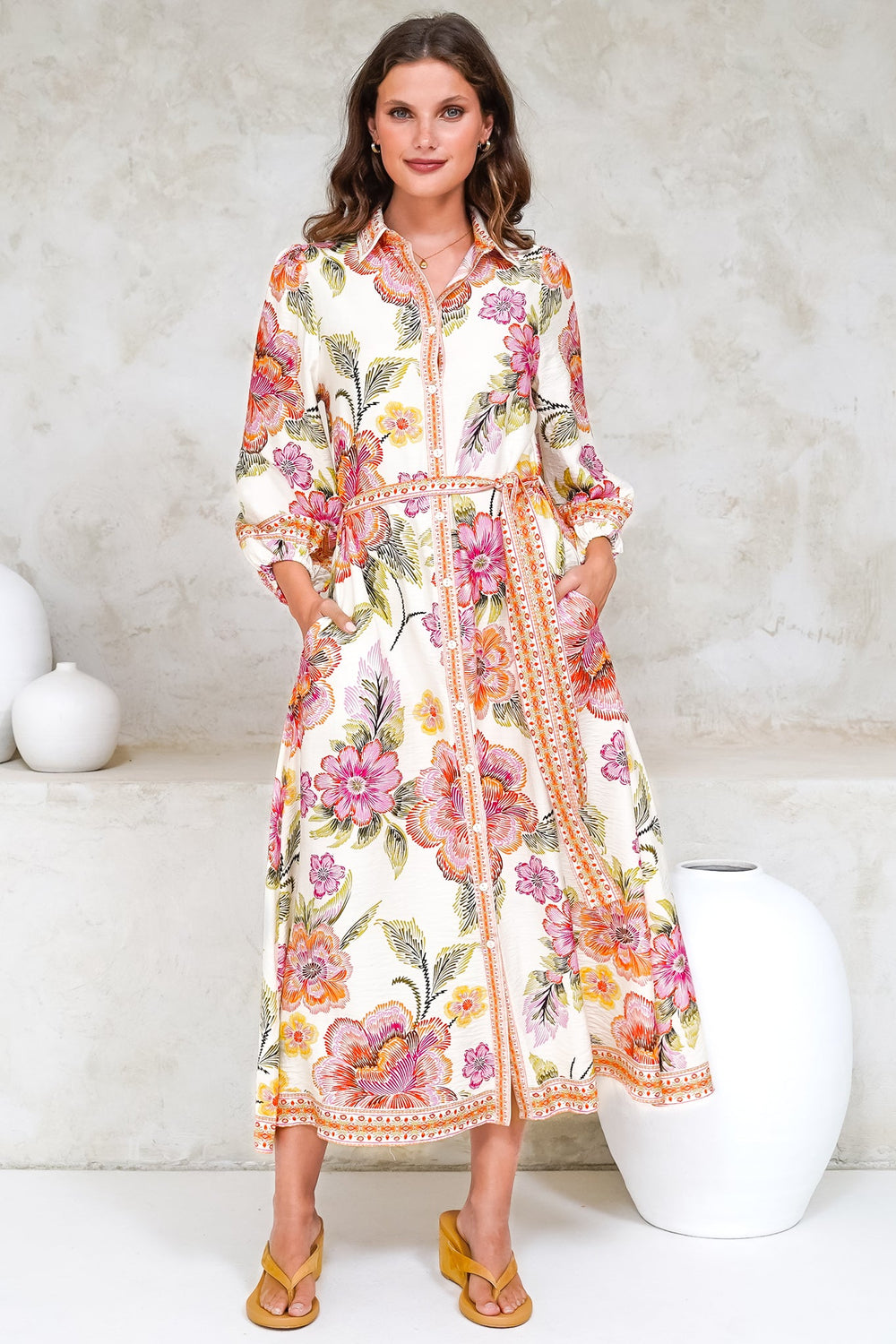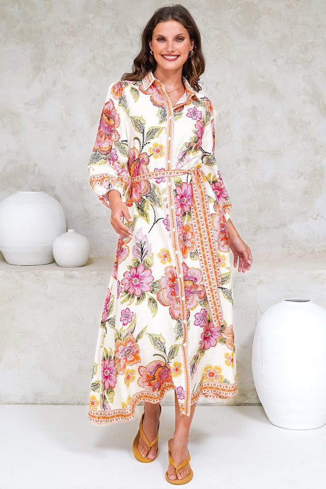 Francis Midi Dress - Collared Shirt Dress with Matching Belt in Elle Print Pink