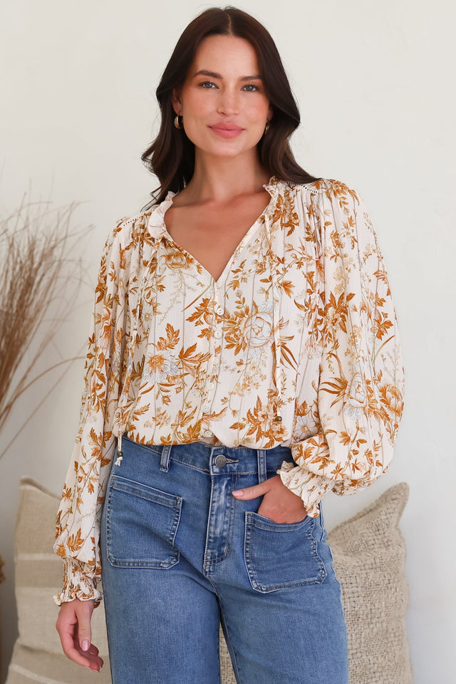 Moree Blouse - Frill Collar Neck Tie Button Down Shirt in Sorrento Print Cream