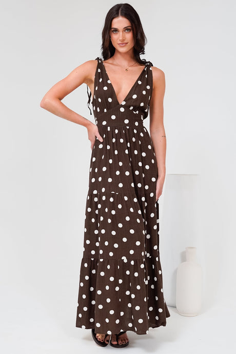 Maude Maxi Dress - Deep V-Neck Ties on Shoulders Tiered Dress in Kitson Spot Print Chocolate