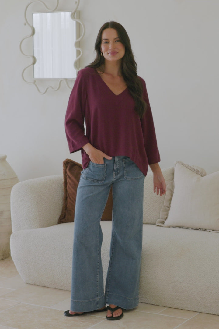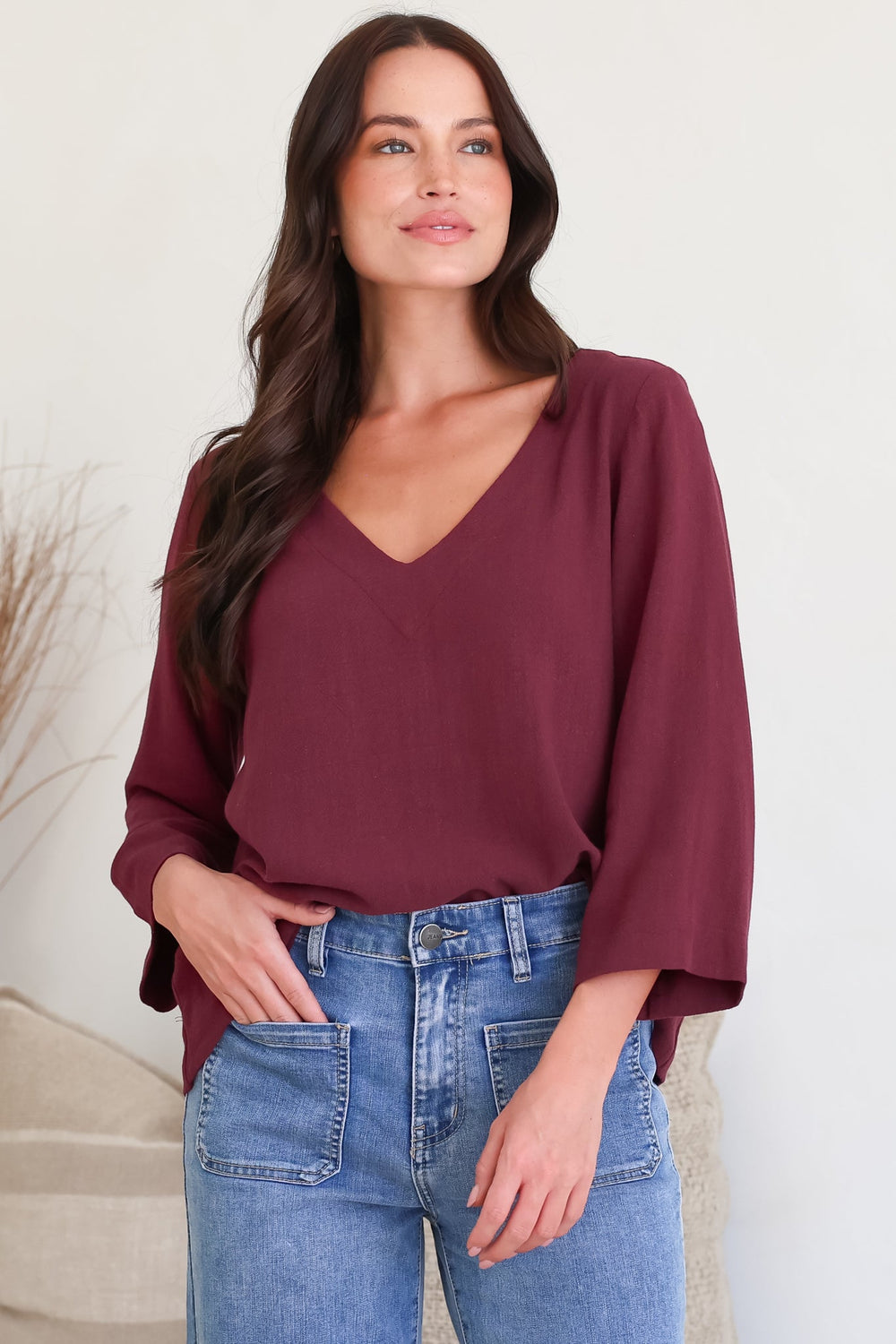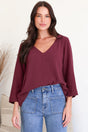 Breezer Top - Long Sleeve V Neck Pull Over Top with High Low Hemline in Wine