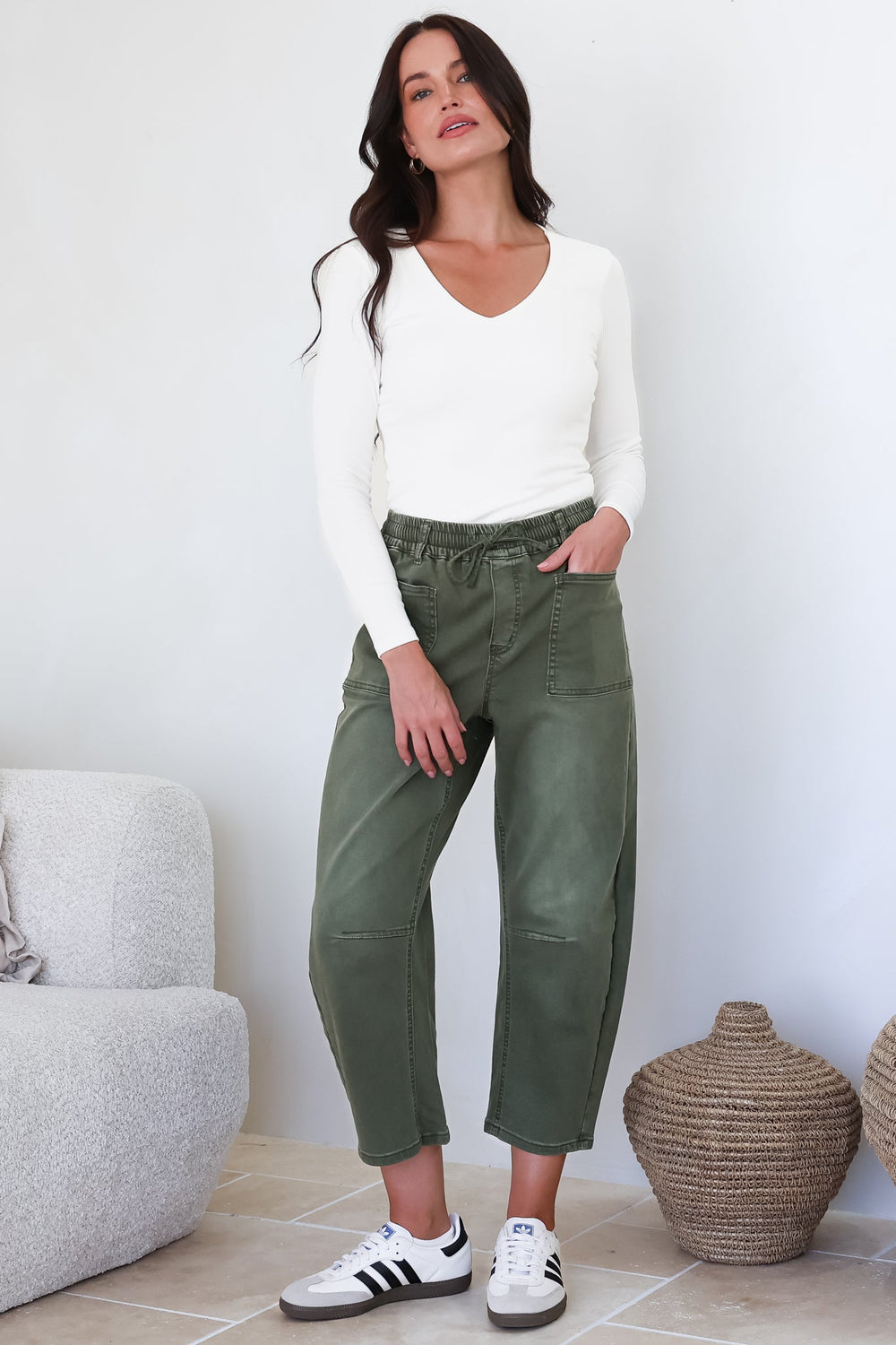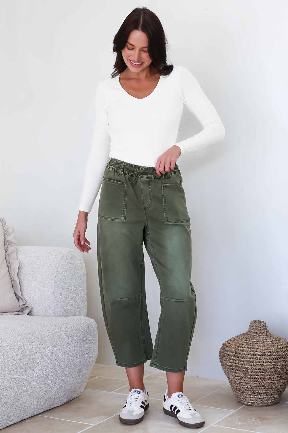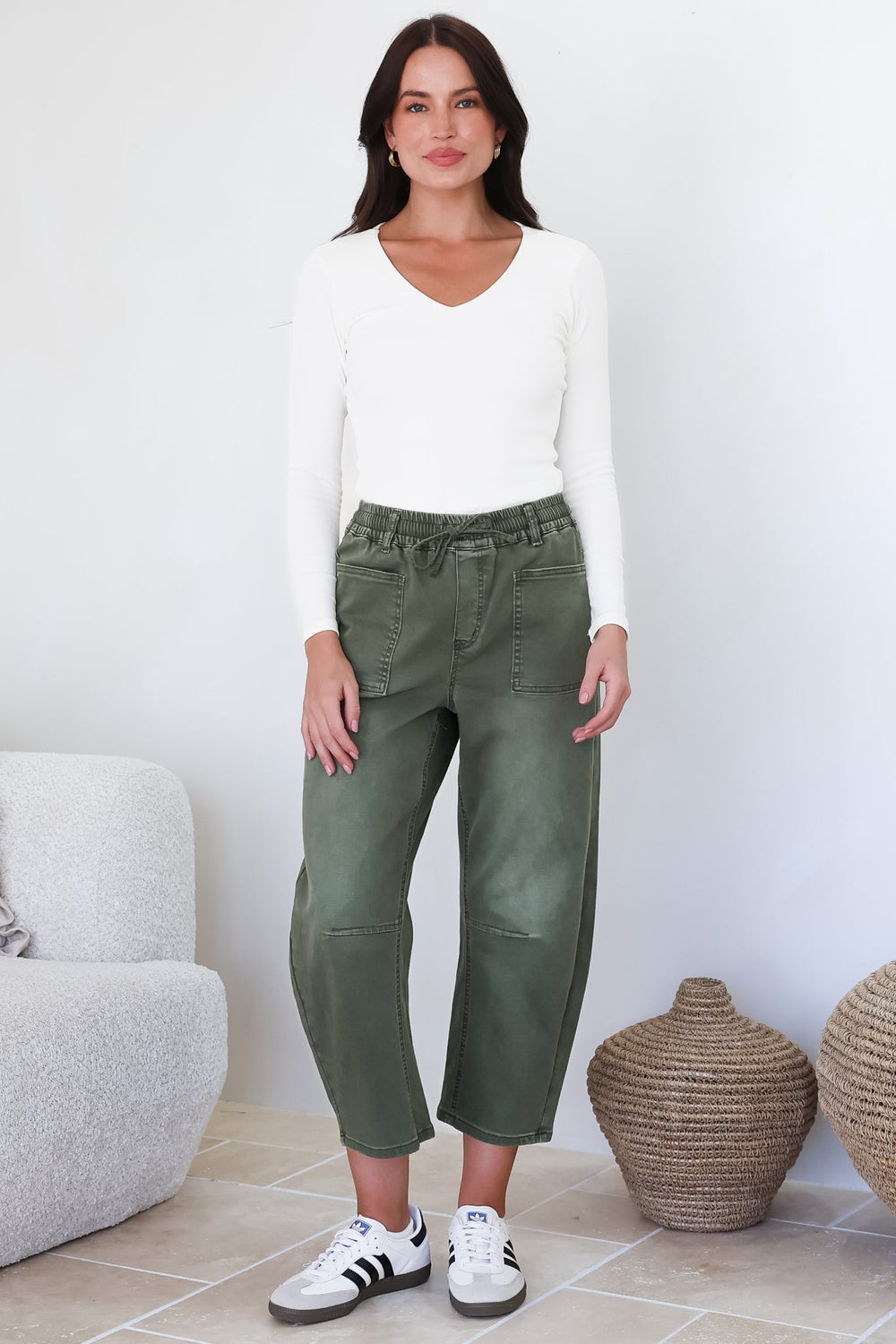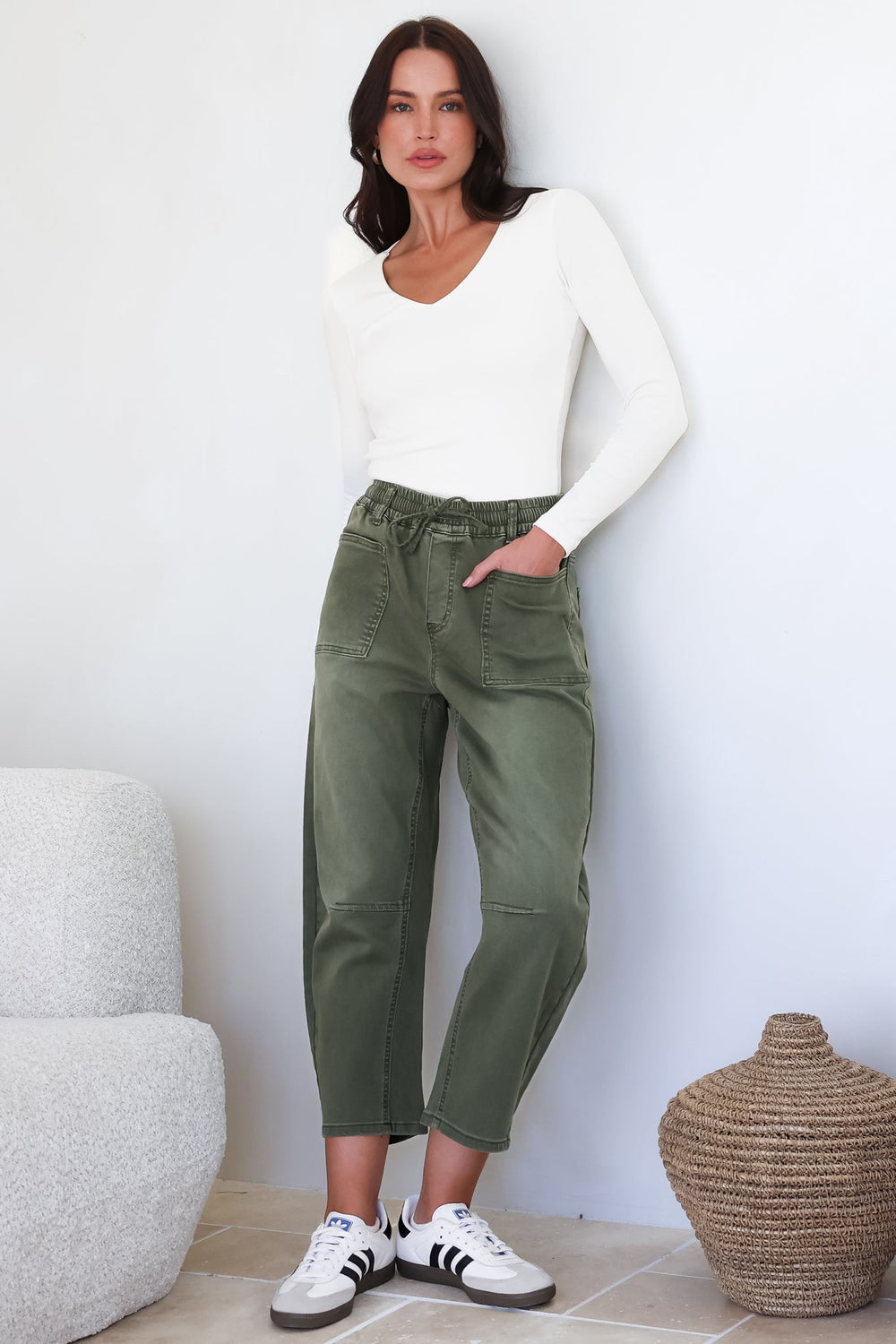 Lowen Barrel Jeans - Elasticated Waist Patch Pocket & Knee Detail Jeans in Khaki