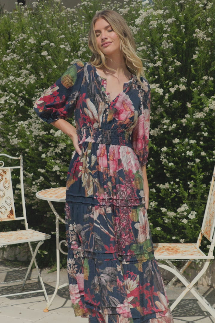 Make an entrance in the Mondelo Maxi Dress, a Salty Crush exclusive designed for those special moments that matter. The stunning Leonor Print in Navy brings a sophisticated edge to this flowing silhouette, while the relaxed fit ensures you move with ease from beach to bar. This is dressing at its finest - effortless, elegant, and utterly unforgettable.