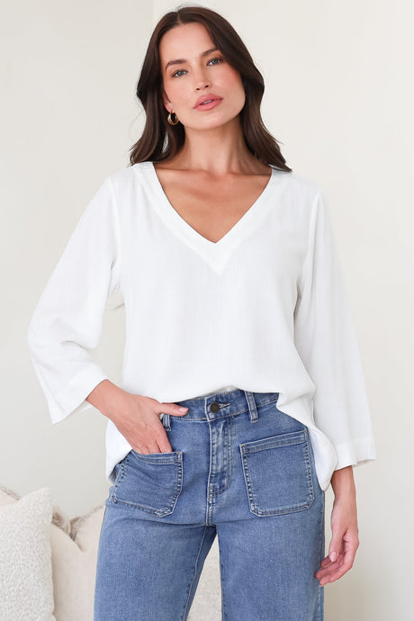 • Model wearing Breezer Top in Black from Salty Crush Breezer Top - Long Sleeve V Neck Pull Over Top with High Low Hemline in Black