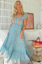 • JAASE - Carmen Maxi Dress: Butterfly Cap Sleeve Button Down A Line Dress with Lace Trim in Indigo Print
