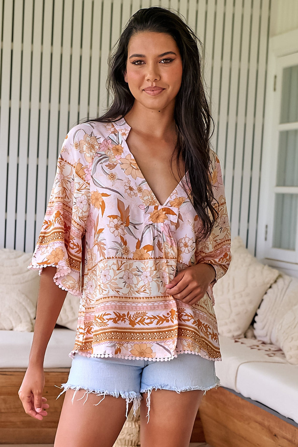 JAASE - Gabriella Top: Mandarin Collar Deep V Neck Crochet Trim Top in Peach Dahlia Print