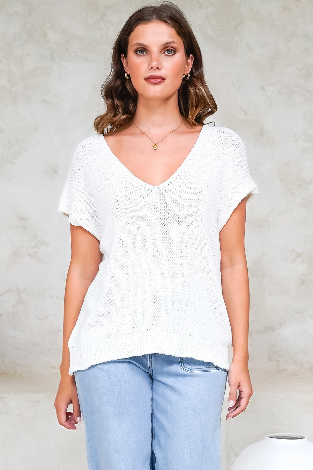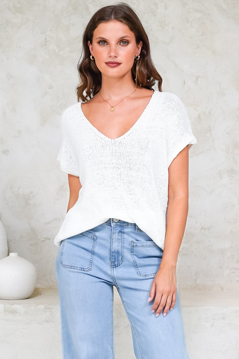Millicent Knit Top - Relaxed V-Neck Top with Ribbed Hemline in White