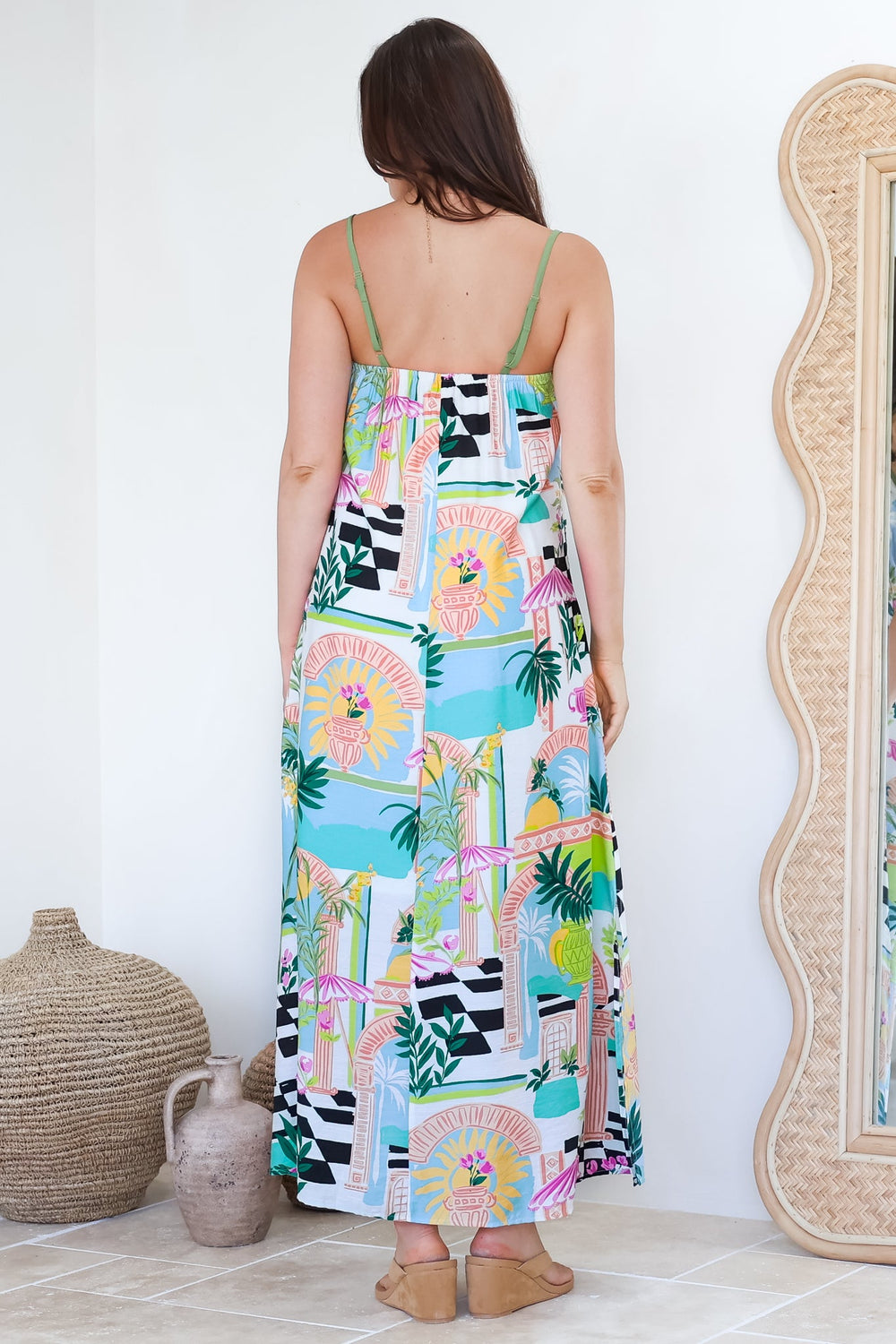 Our Abie Maxi Dress is a statement-making piece full of colour and personality. With its bold artistic print, flowy silhouette, and adjustable straps, this easy-to-wear style combines comfort with eye-catching elegance — perfect for summer getaways or resort days.