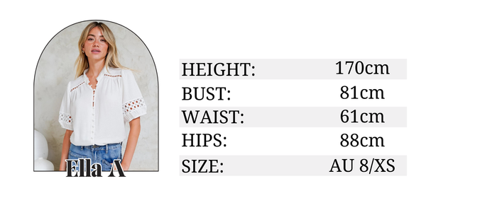 *All sizing is listed in Australian sizes and measurements are listed in centimetres and measured by hand at Salty Crush HQ.