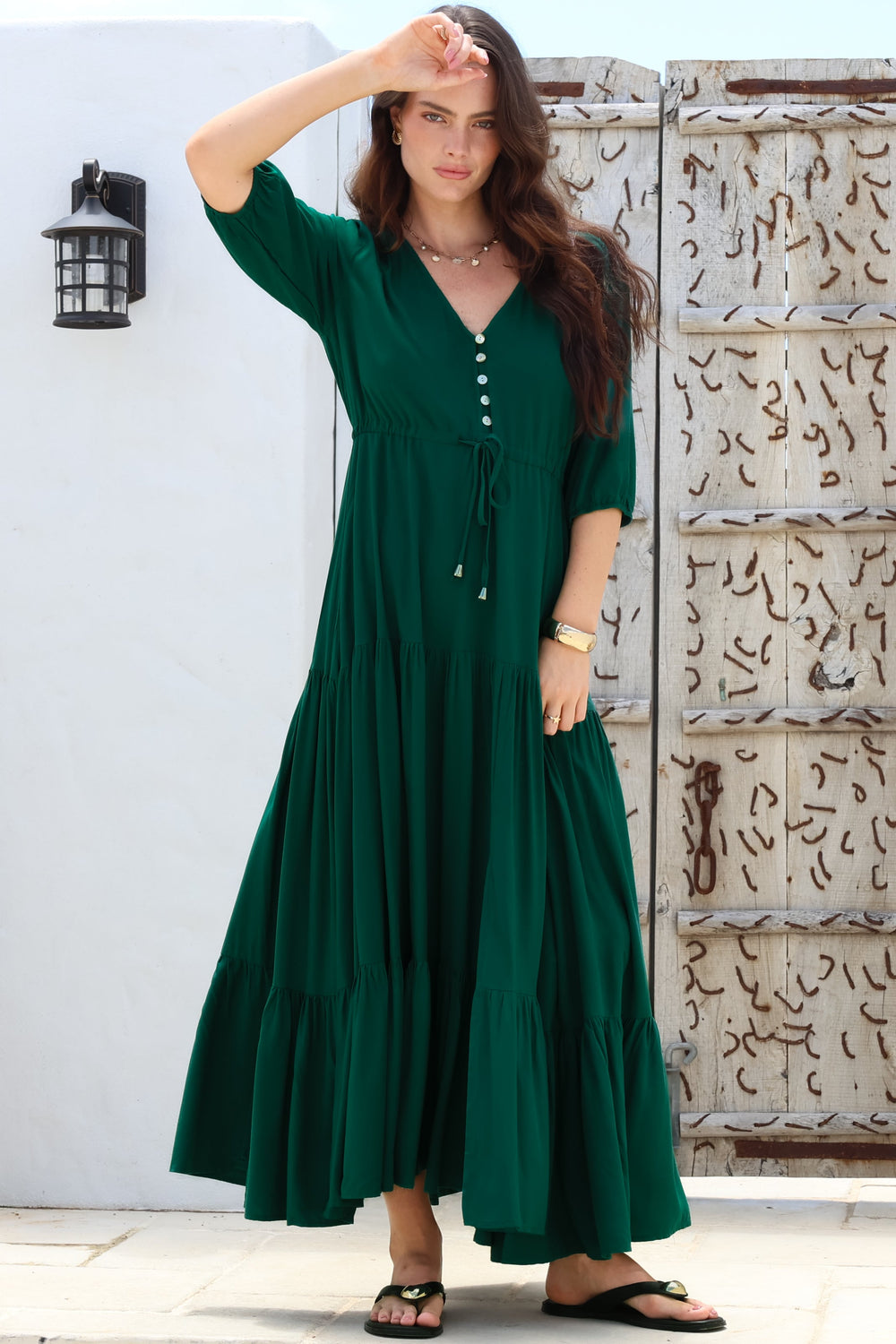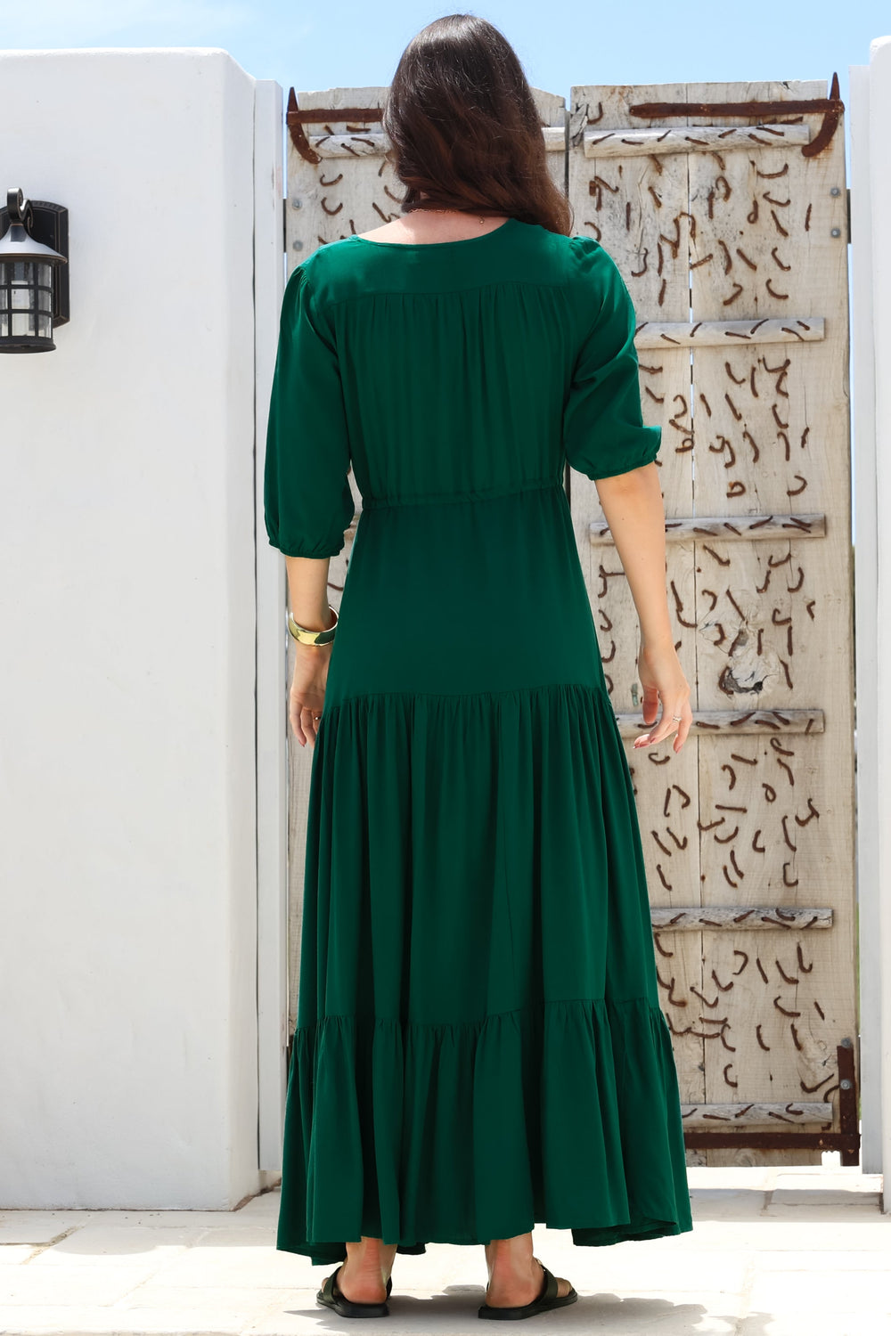 Rachel Maxi Dress - V-Neck 3/4 Sleeve Pull Tie Waist Tiered Dress in Emerald
