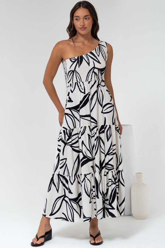 Make a bold statement with the Kleo Midi Dress, a striking blend of modern design and effortless elegance. Featuring a black abstract leaf print on a crisp white base, this dress brings a sophisticated yet relaxed vibe perfect for summer outings or resort escapes.