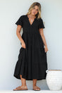 Milla Midi Dress - Tiered Cap Sleeve Button Down Linen Dress in Black