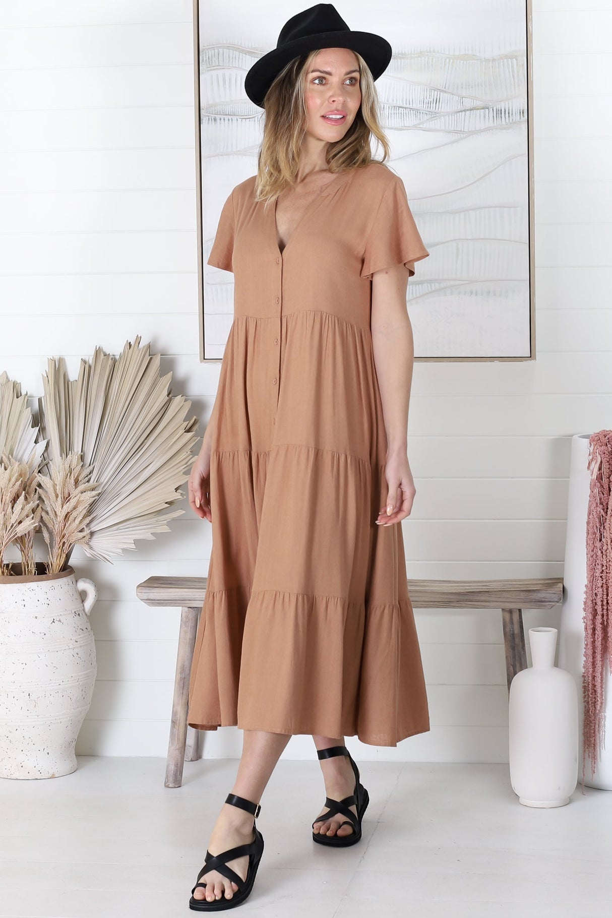 Milla Midi Dress - Tiered Cap Sleeve Button Down Linen Dress in Tan