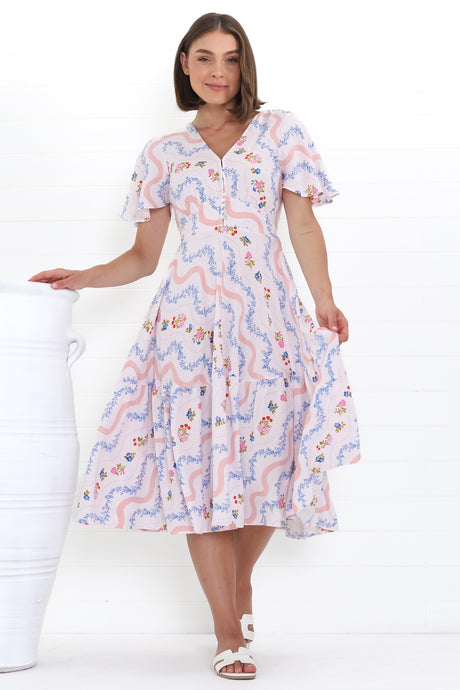 • Vinnie Midi Dress - V-Neck Dress with Short Flutter Sleeves in Rosita Print