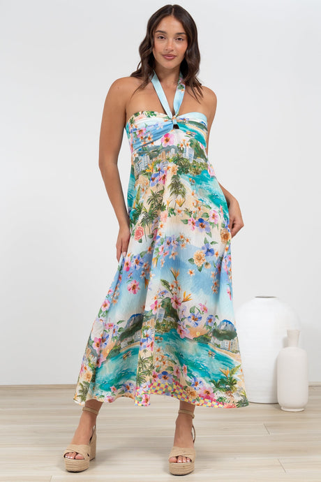 • JAASE - Eve Midi Dress: V Neck Tiered Dress with Option Waist Tie in Under The Stars Print