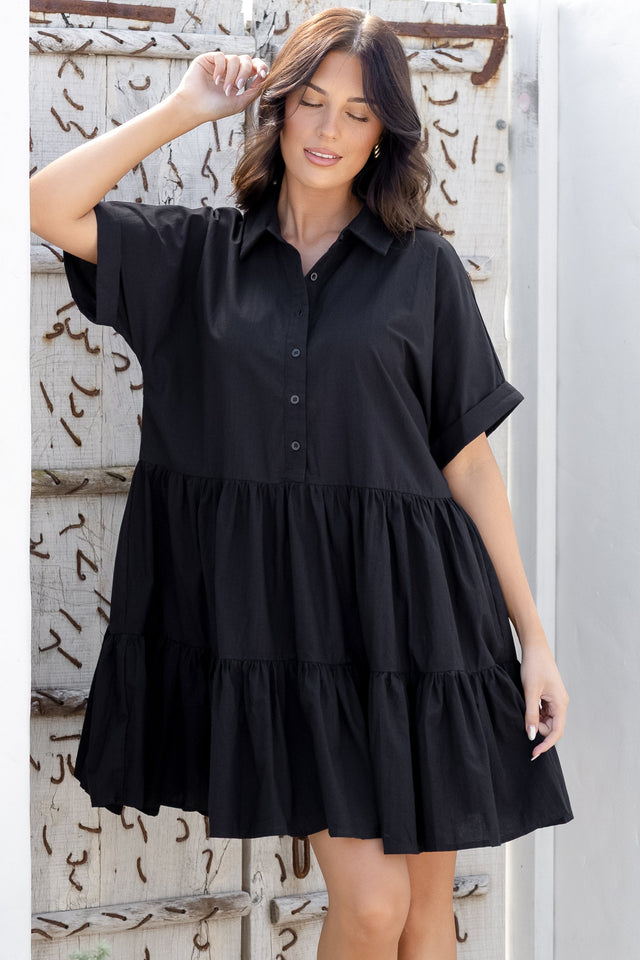 Estelle Mini Dress - Collared Tiered Smock Dress in Black