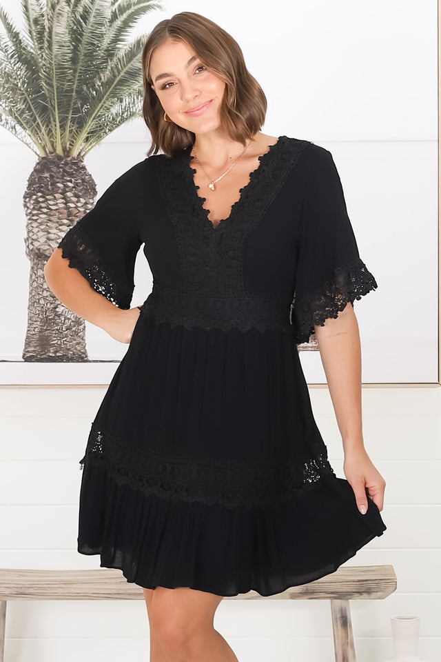 Leelie Mini Dress - Lace Embellished Tiered Dress with Bell Sleeves in Black