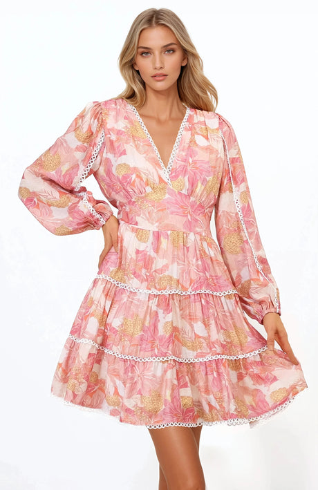 Audrey Mini Dress - Delicately Detailed Tiered A-Line Dress in Lola Print Pink