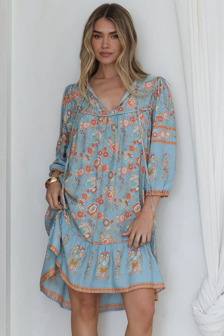 Helda Mini Dress - V-Neck Shift Dress with Balloon Sleeves in Aletta Print Blue