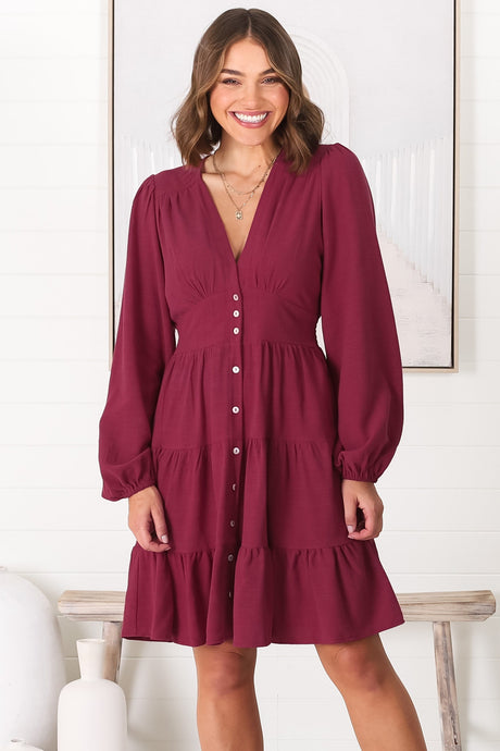 Soho Mini Dress - A Line Button Down Tiered Dress in Berry