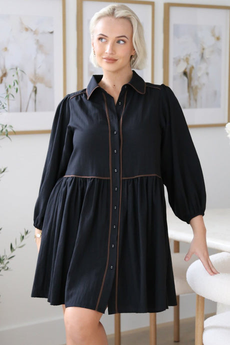 Tenley Mini Dress - Contrast Trim Button Down Smock Dress in Black