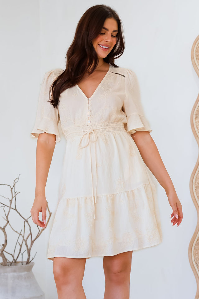 Truese Mini Dress - A-Line Dress with Short Ruffle Sleeves in Cream Embroidery