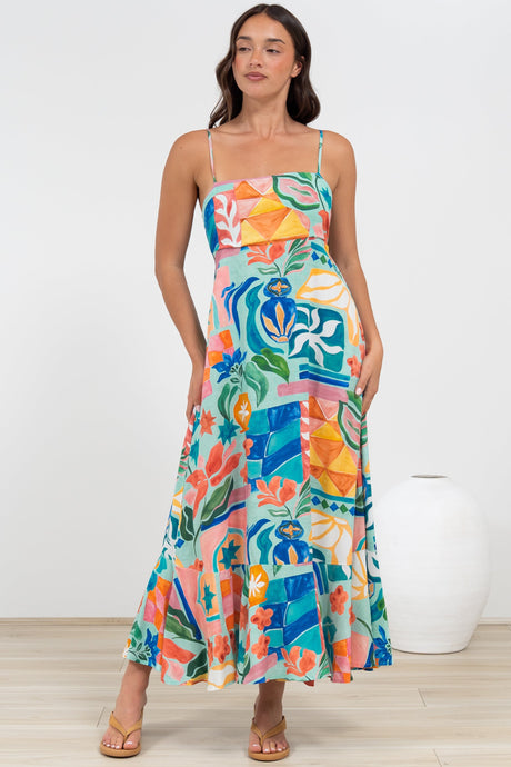 Rinna Midi Dress - Adjustable Strap with Tie Back Sun Dress in Anika Print