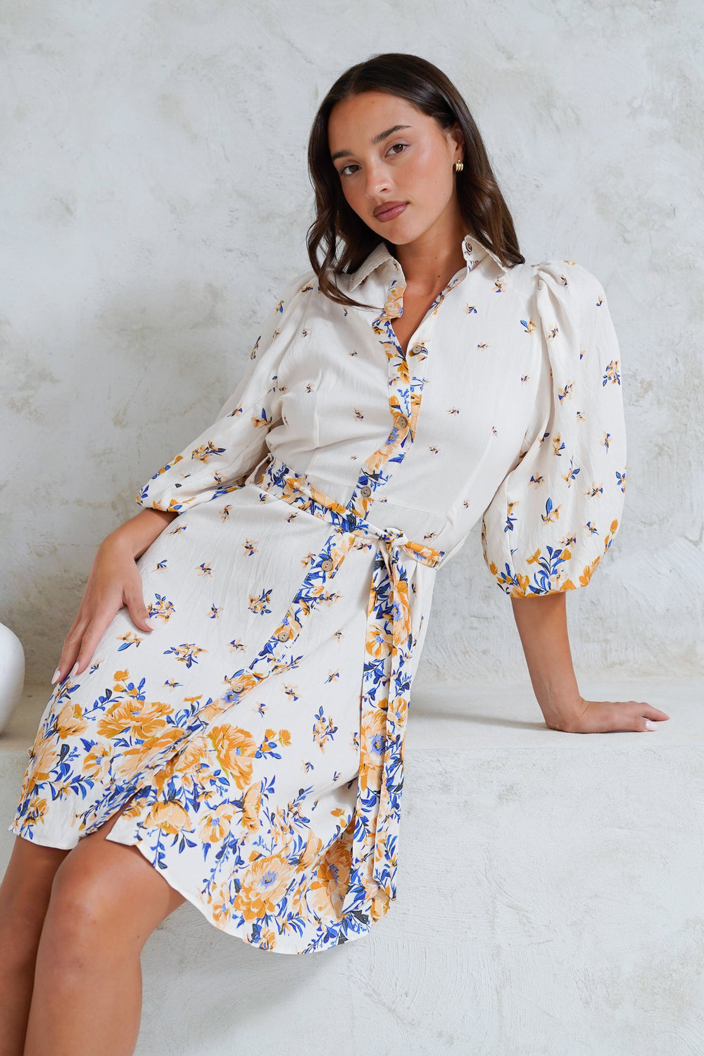 Our Francine mini dress is an effortlessly charming take on the classic shirt-dress, featuring a crisp collar and full-length button placket for a structured feel. Designed with dramatic puff sleeves and cinched at the waist with a wide, matching self-tie belt, this piece creates a feminine and defined silhouette. The easy-wearing short length makes it perfect for warmer days.