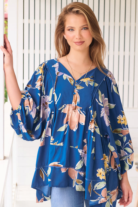JAASE - Adela Blouse: Lace Detailed Oversized Blouse in Georgia Blue Print