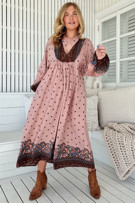 Rylie Maxi Dress - Embroidered Long Sleeve Dress with Pull Tie Waist in Vesper Print Brown