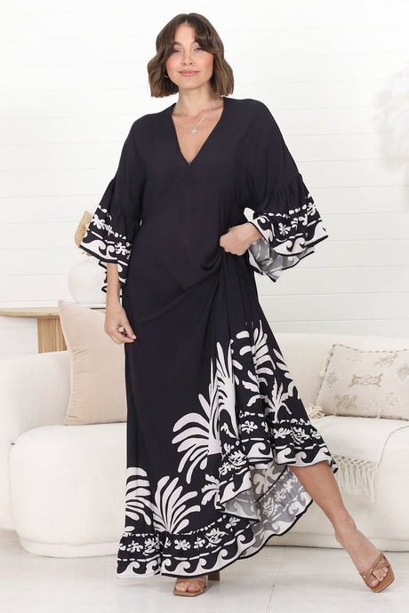Sasha Maxi Dress - Buttoned Bodice A Line Dress With Flute Sleeves In Raven Print Navy