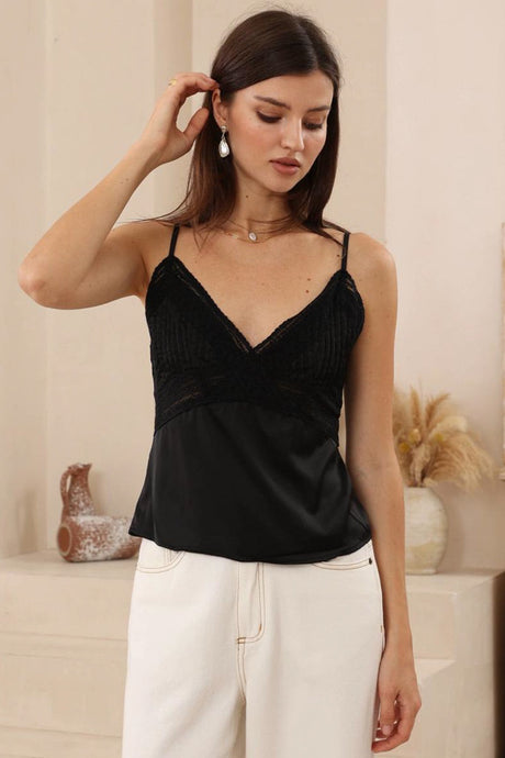 Giselle Cami - Silky Lace Trim Pintuck Bodice Cami in Black