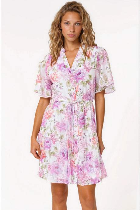 JAASE - Tracey Mini Dress: 3/4 Sleeve Dress with Waist Tie in Blushing Fields Print
