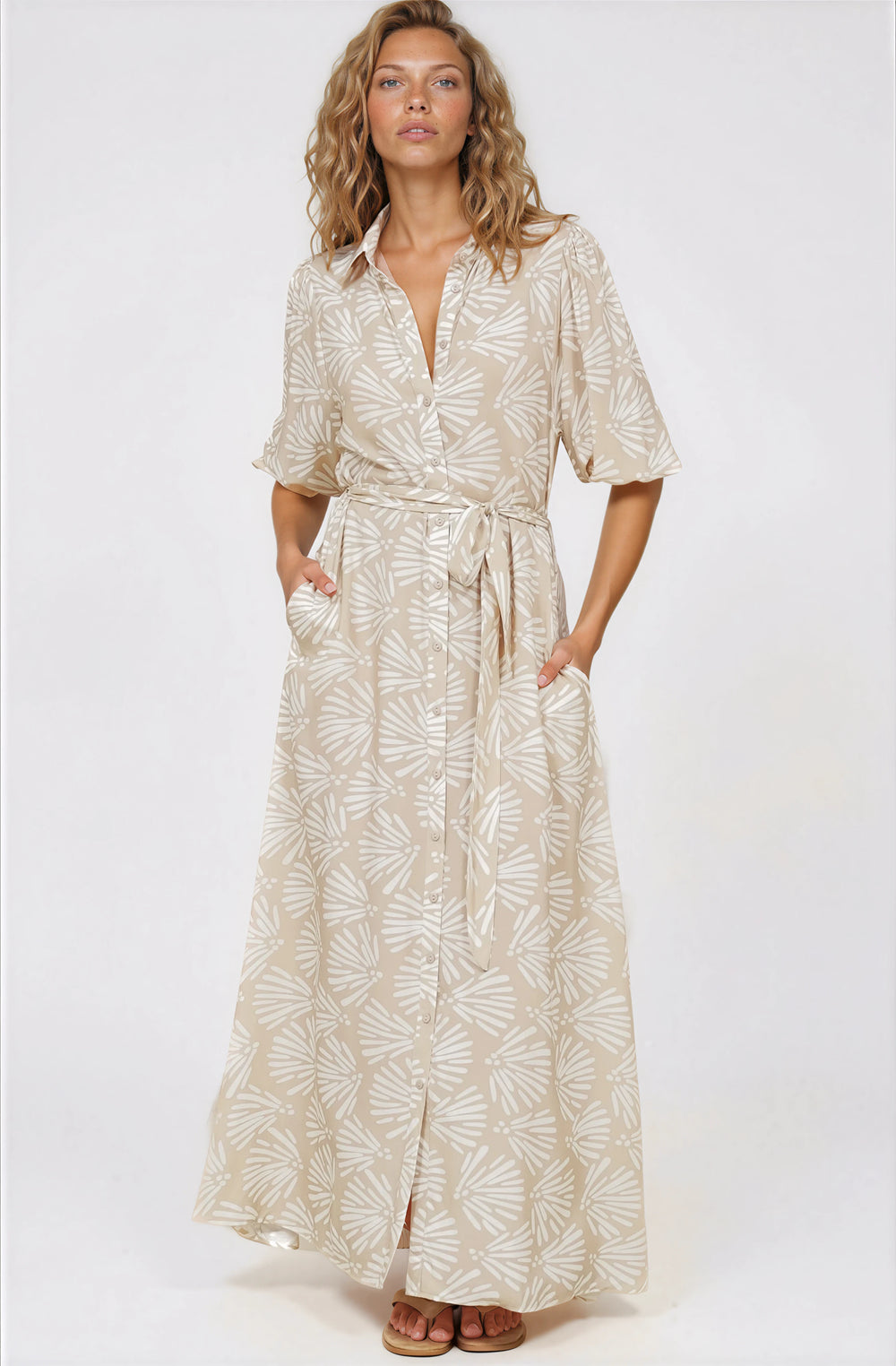 Brea Maxi Dress - Collared Shirt Dress with Belt in Catia Print Beige
