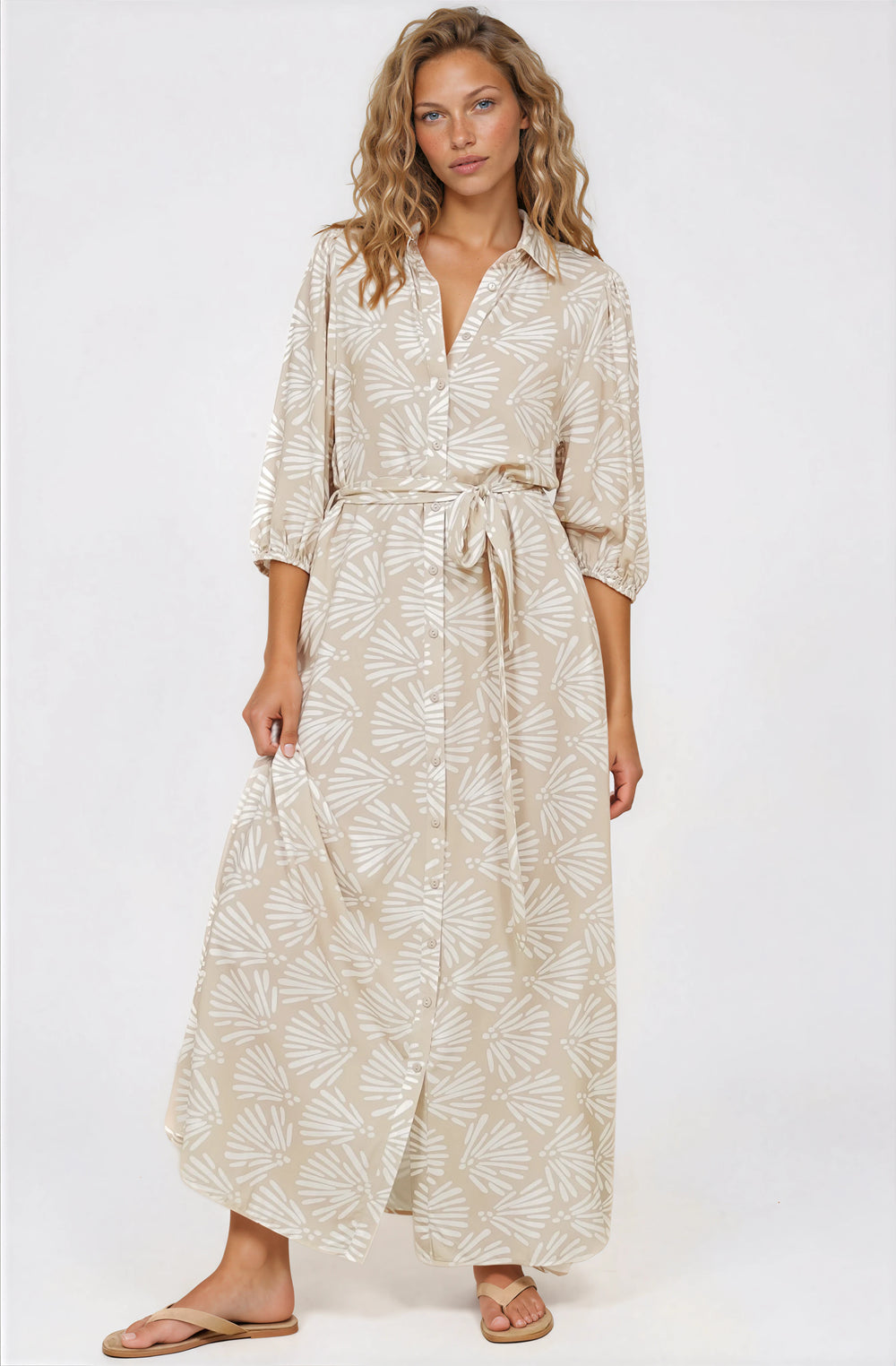 Sophisticated ease meets effortless elegance in the Brea Maxi Dress. Adorned with a delicate Catia print in soft beige tones, this flowing silhouette features a flattering collar neckline and relaxed 3/4 sleeves that strike the perfect balance between polished and laid-back. The self-tie waist cinches your silhouette while the maxi length creates beautiful movement with every step - ideal for sunset dinners, garden parties, or wherever your next adventure calls.