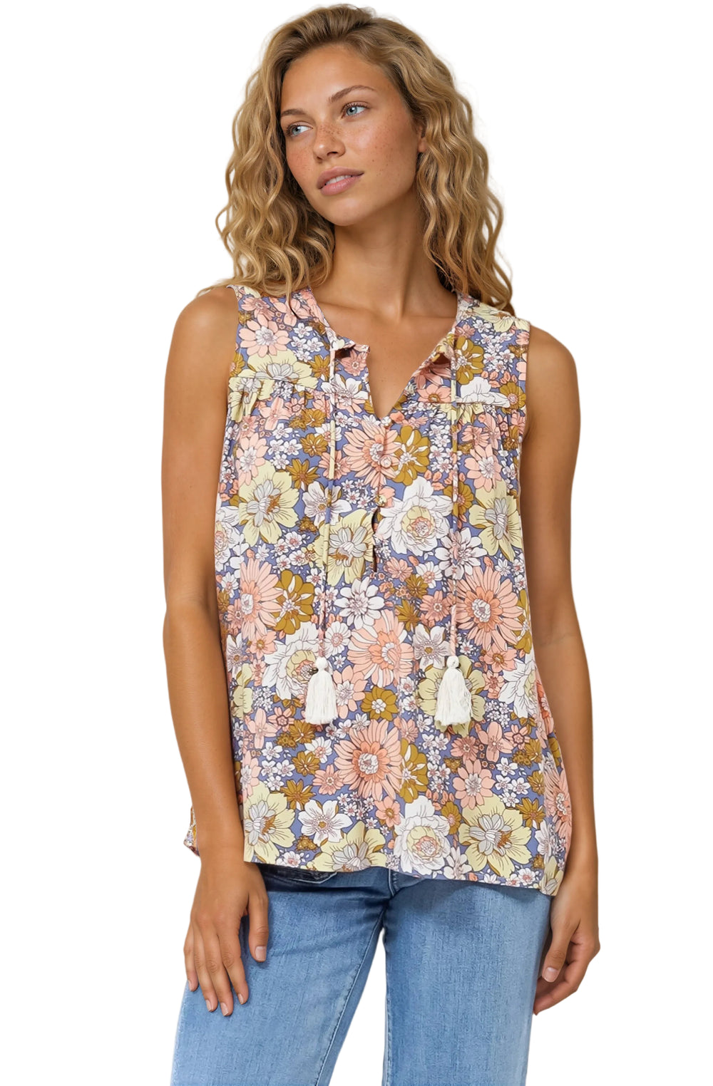 Kalari Top - Sleeveless Mandarin Collar with Tassel & Bells Neck Tie in Avianna Print