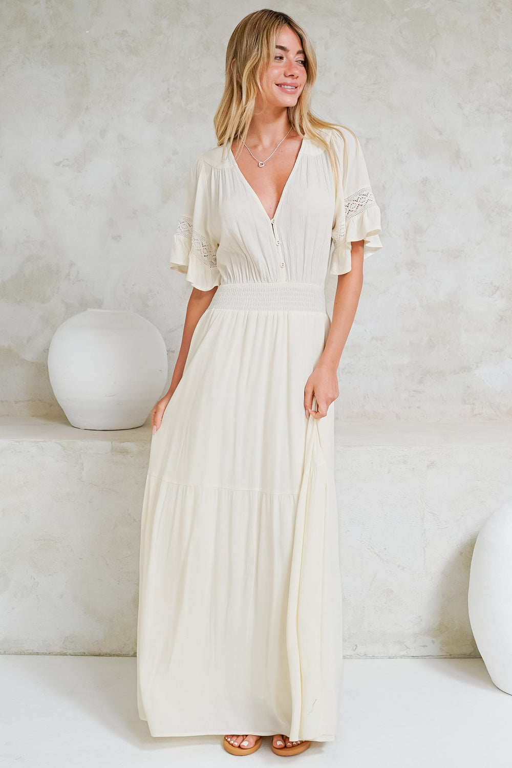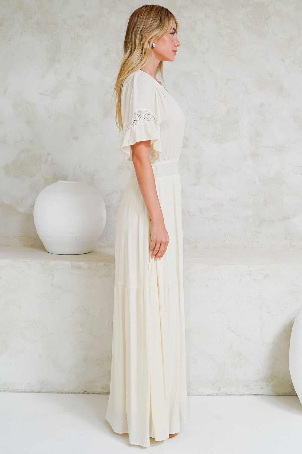 Alexandra Maxi Dress - Delicate Lace Detailed A-Line Dress with Short Sleeves in Cream