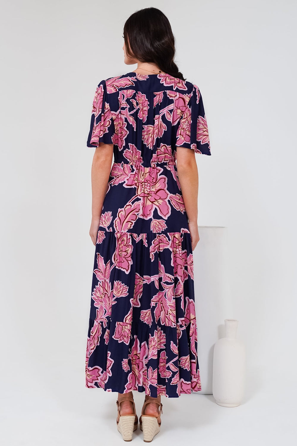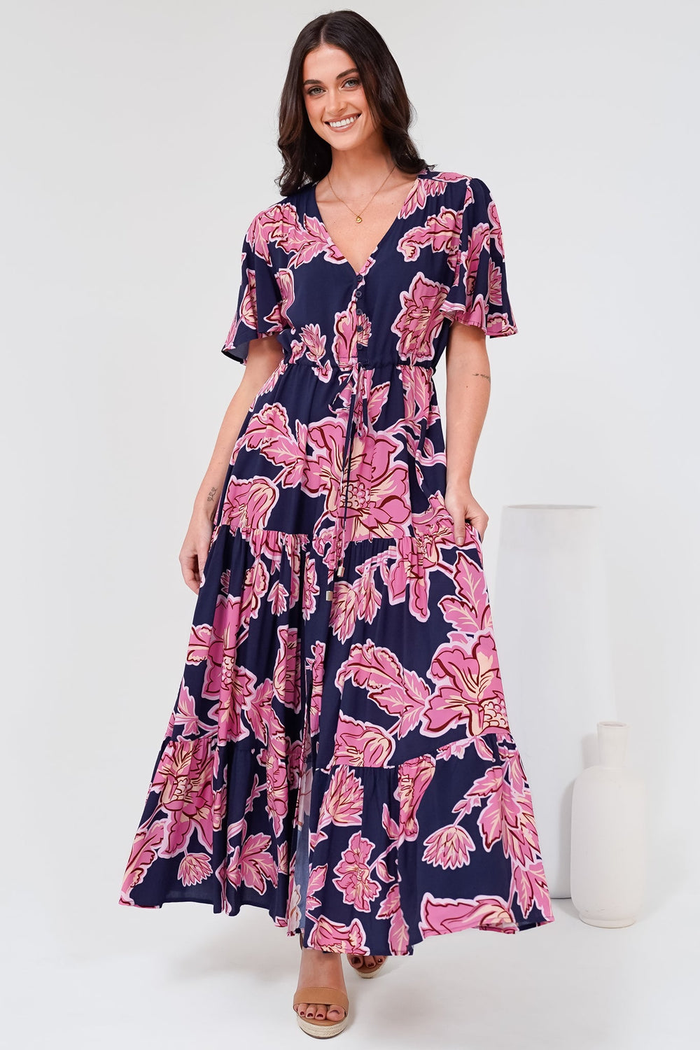 Anya Maxi Dress - Flutter Cap Sleeve Pull Tie Waist Dress in Kalia Print Navy