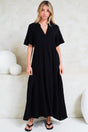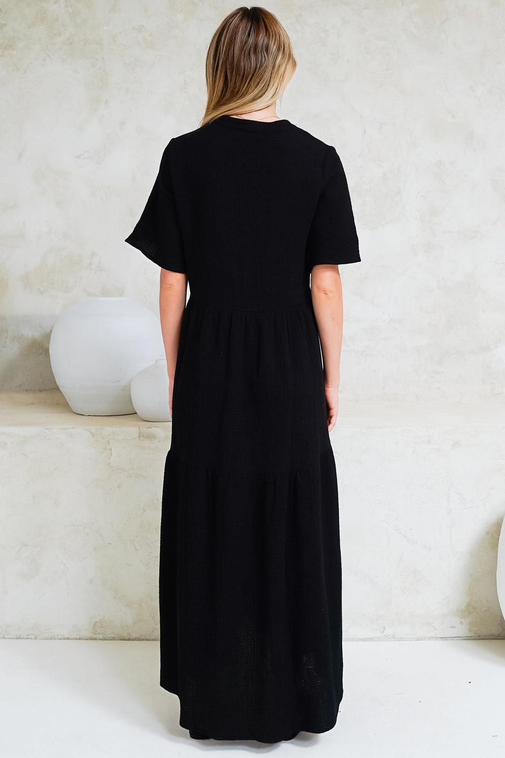 Laysa Maxi Dress - Mandarin Collar Short Sleeve Dress in Black